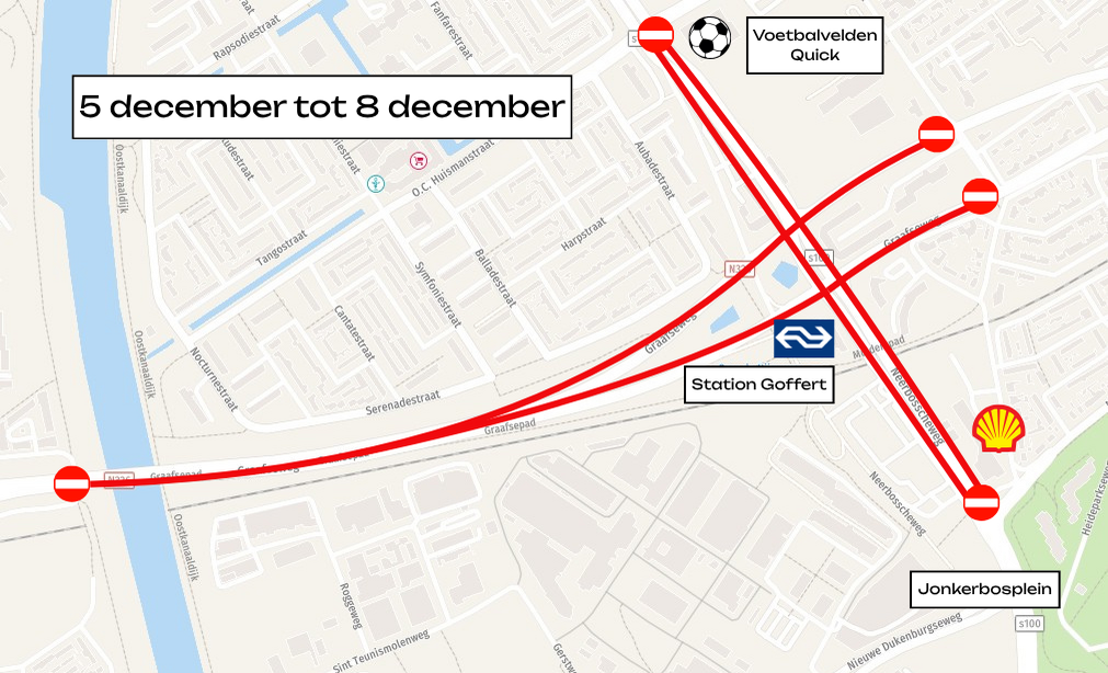 Op 4 december van 06:00 tot 16:00 uur is het tijdelijke fietspad over de Graafseweg afgesloten. Je kunt station Goffert dan per fiets en te voet bereiken via het Mulderspad en het Graafsepad. De rest van het weekend is het tijdelijke fietspad wel open. Fietsers en voetgangers kunnen dan ook weer vanuit de Aubadestraat richting station Goffert.