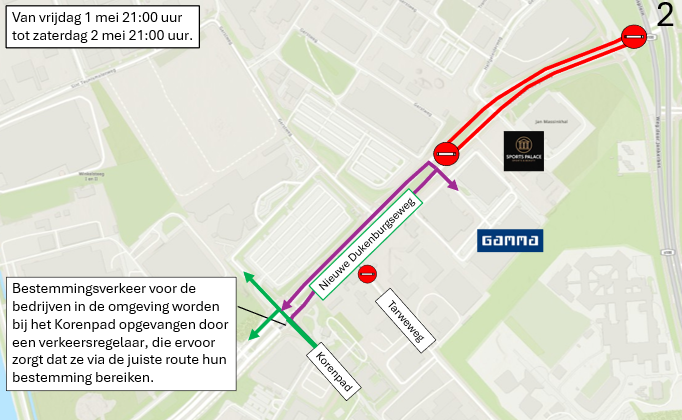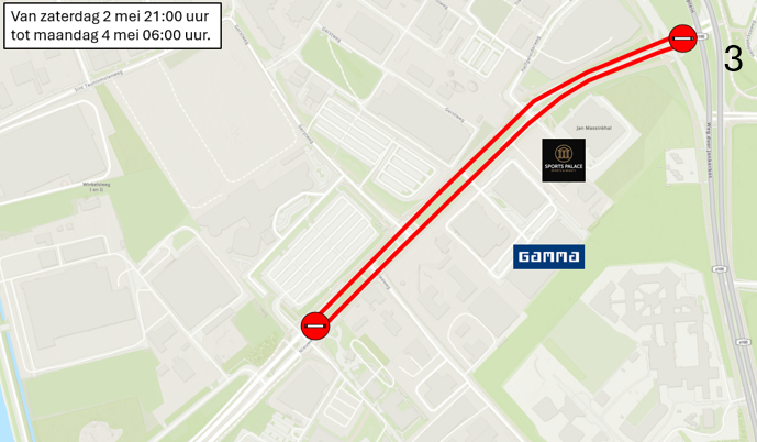 De weg is in beide richtingen dicht tussen het Jonkerbosplein en het bedrijventerrein (met onder andere de Gamma).
